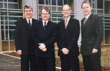 The senior BRE management team when the BRE Trust was founded included, left to right: Martin Shaw (Director of Fire Research), Martin Wyatt (CEO of BRE), Roger Courtney (Director of BRE), James Horan (Finance Director).